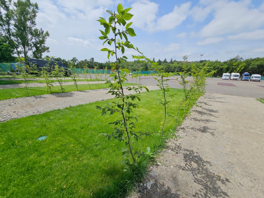 - na zelené ploše, respektive místo na stání je štěrkové, místo pro vyložení věcí a venkovního nábytku travnaté -10 míst