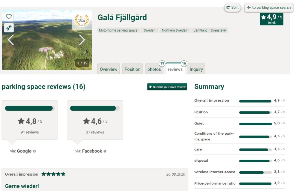 Komentář: Škoda, že vyhlašování nezohledňuje i zastoupení karavanistů, z výsledků je zřejmé, že portál stepplatz.info využívají spíše němečtí karavanisté a tomu odpovídá umístnění, neněmecké země jsou tak značně znevýhodněny. I v ČR by se asi našli místa, která by měla šanci na úspěch. Například pro porovnání, jedno z vítězných míst ve Švédsku a české Buliro – to zaostává jen v počtech recenzích na FB a trochu mírně na vlastním serveru: