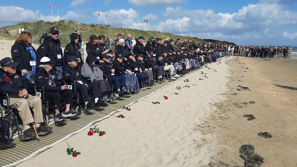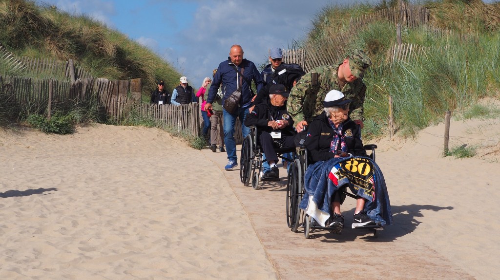 Dopoledne jdeme na obhlídku k muzeu, v jehož blízkosti je i památník a plocha pro ceremoniály. A tady se něco děje. A tak jsme se náhodou přichomýtli k setkání s americkými veterány, účastníky tehdejších bojů o Normandii. Těm chlapům je kolem 100 let a více. Je jich tu asi 30. Celá situace je velice působivá. Po projevu zpívá sbor americké armády a následně od památníku zatroubí do hrobového ticha vojenský trubač další působivou skladbu. Akce má další pokračování, kdy mladí členové amerického pěveckého sboru vytlačí veterány na kolečkových křeslech bezprostředně na pobřeží. „Stojí“ tu nastoupeni v řadě čelem k oceánu, každý dostal růži a tu symbolicky odhodí směrem k moři. Jak jsem napsal, většina z nich sedí na kolečkových židlích, jeden je ale dost čiperný a ten se obslouží sám. Jmenuje se Frank Perry. Je mu 98 let, sloužil jako palubní střelec v létající pevnosti. Dostali jsme od něj letáček s jeho životopisem, udělali si s ním fotku. Byl velmi příjemný. Večer jsme viděli z této akce TV reportáž ve zprávách na CNN Prima News. Bylo super, že šťastnou náhodou jsme se této ceremonie mohli zúčastnit.