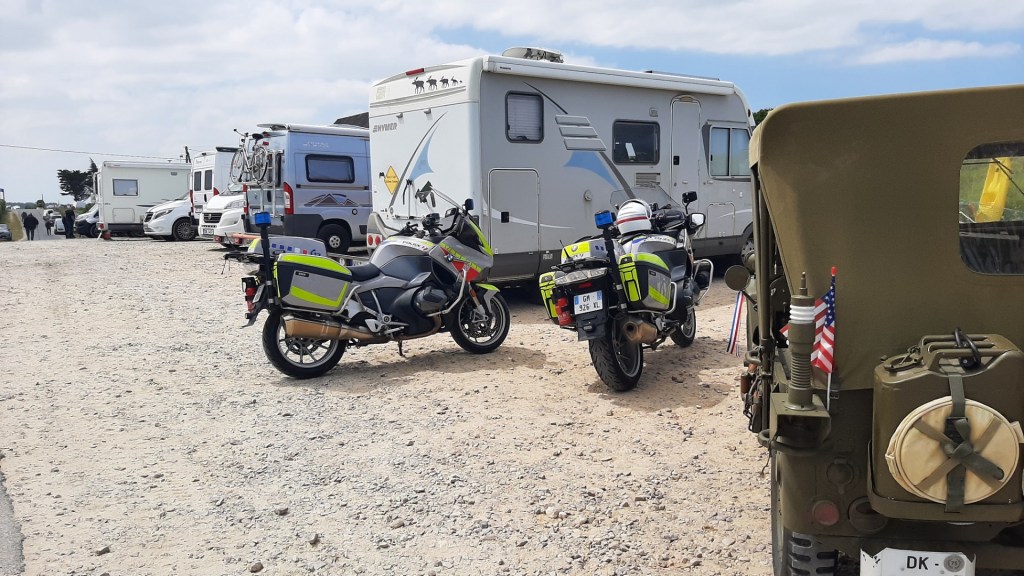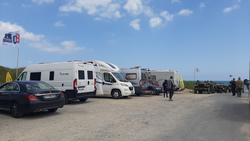 Dostávám zprávu od kolegy, který přijel do Normandie o několik dní dříve, že stojí na pláži Utah a že je tam dost vhodného místa na zaparkování a tak míříme tam. Chtěli jsme tam sice jet až zítra, ale protože jsme ztratili toto odpoledne tolik času, jedeme tam hned. Našli jsme si strategické místo přímo při nájezdu na pláž, vedle zahradního baru a spolu s námi je tu několik dalších obytek z různých zemí Evropy. Pravdou je, že do večera se další prostory v naší blízkosti dost zaplnily dalšími obytkami, takže je dobře, že jsme přijeli včas. Je to dobrá poloha pro další 2 dny, po které tu chceme zůstat.