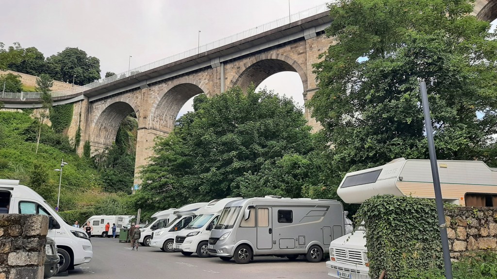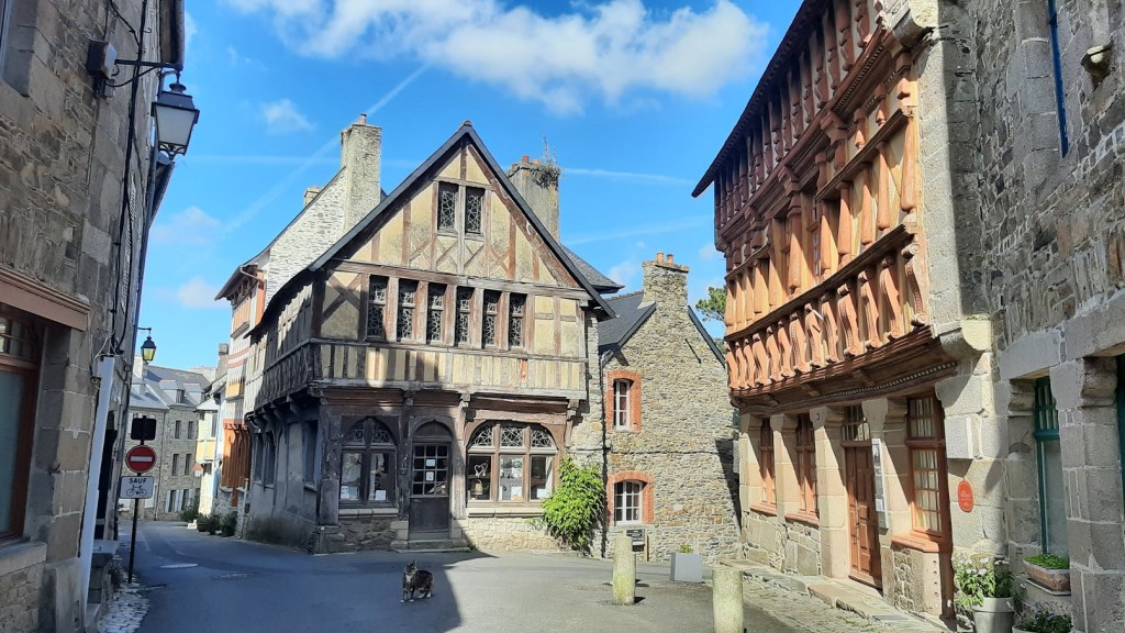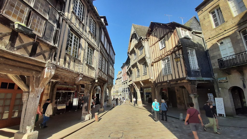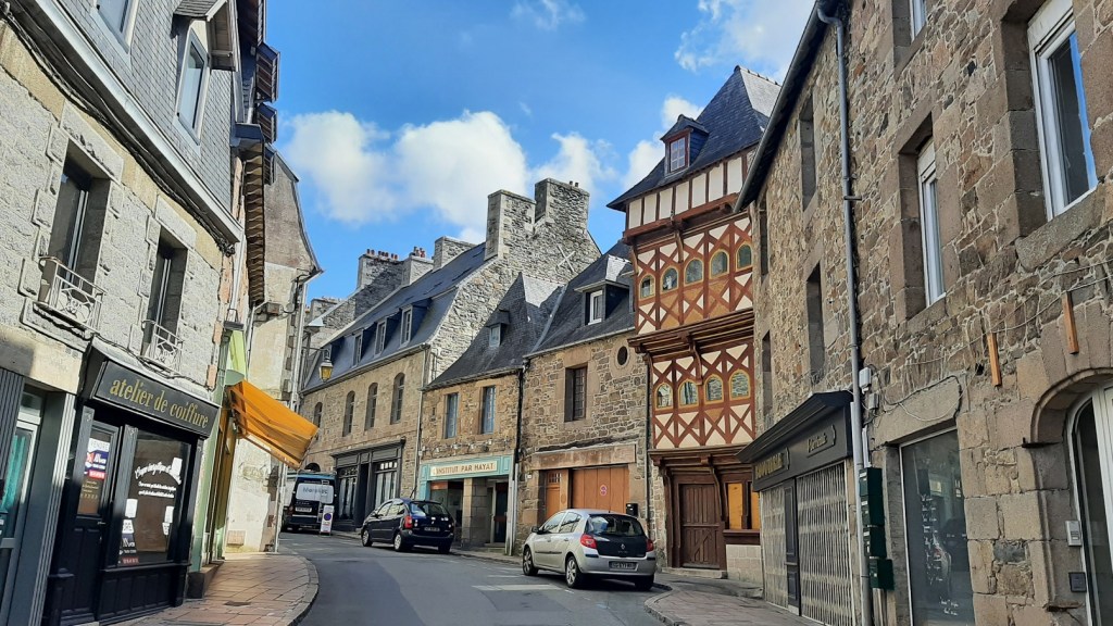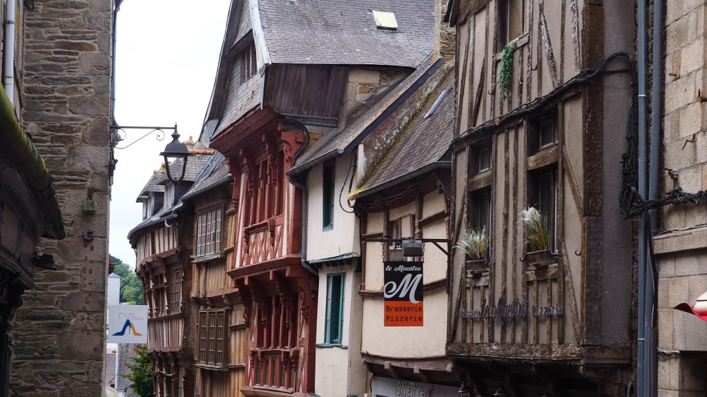 Následně přejíždíme k Rimoru, děláme si oběd a po něm pokračujeme v cestě do dnešní cílové destinace a tou je středověké město Dinan. Našli jsme si štelplac pod viaduktem, pod hradbami města, v parkovacím automatu platíme 3,80€ na 24 hod. a vyrážíme na prohlídku města. Jinak štelplc je bez služeb (alespoň jsem si žádných nevšiml), takže jde vlastně jen o takové parkoviště, kde jsou vyhrazena místa pro karavany. V přístupové ulici k parkovišti je ale dobře udržované veřejné WC, což se taky hodí. Prohlídka města stojí za to. Při popisu jeho historického charakteru by člověk musel použít ty nejvyšší superlativy. Historické hrázděné budovy z 14.-15. století jsou samozřejmostí. V centru města vystupujeme na „hodinovou věž“(vstup 4€), odkud je parádní výhled a která je zároveň něco jako muzeum. S návštěvou města jsme opět vrchovatě spokojení.