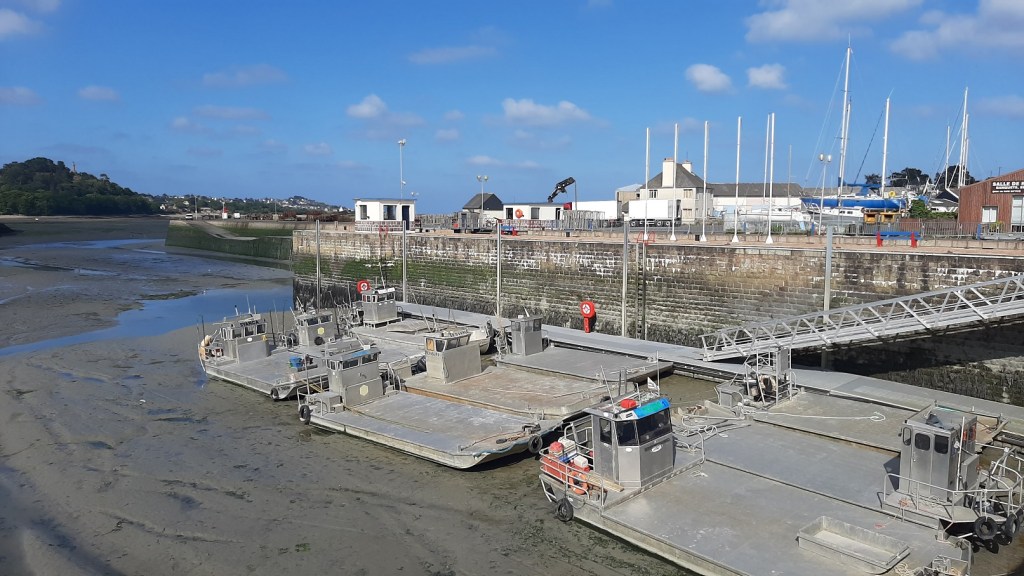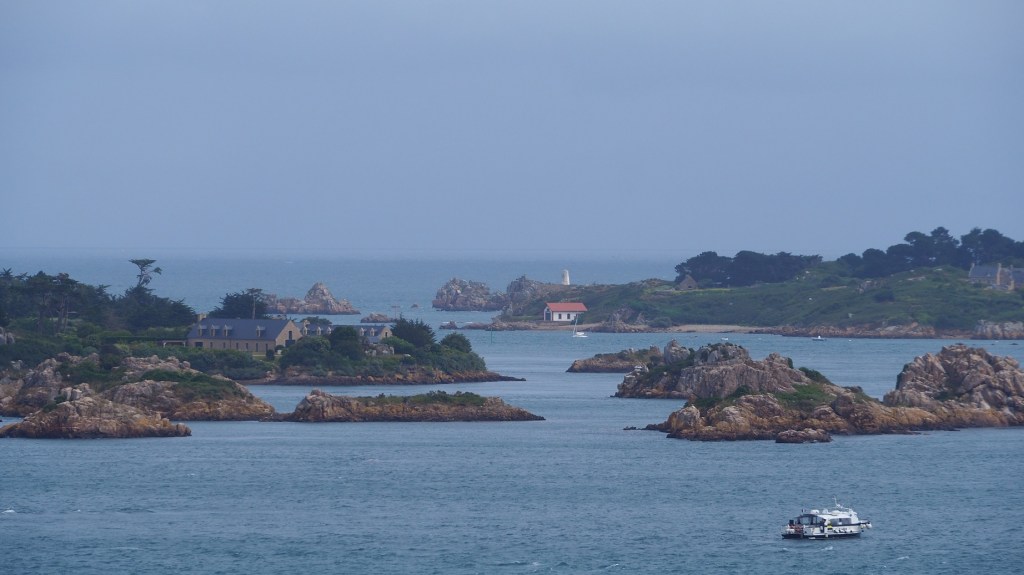 Dále pokračujeme k vesnici L’Arcouest, kde jsou hlavní atrakcí lodní výlety na Ile-de-Bréhat. Může to být pěkný zážitek za pěkného počasí, ovšem teď skoro prší, je šedivě temné nebe a paní od prodeje lodních lístků nám říká, že výlet je to na několik hodin. Takže tuto akci vzdáváme, ostrovy si zdálky fotíme a pozorujeme dalekohledem. Někteří z nás chtějí jet dále do rybářské vesnice Loguivy de la Mer (což je trochu zajížďka) jiní protestují a argumentují, že je to zbytečné. Nakonec jsme tam jeli s využitím velmi úzkých přístupových komunikací a zbytečné to vůbec nebylo. Šlo o krásnou autentickou rybářskou vesnici s parkováním pro karavany přímo na nábřeží a s úžasnou mořskou scenérií. Přivezli jsme si odtud obrovského kraba (skelet).