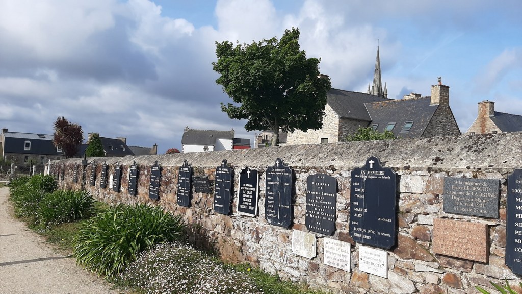 Z Paimpolu ráno vyrážíme dále na sever k pobřeží, ze kterého je vidět Bréhatské souostroví. Ještě předtím však zastavujeme v první vesnici za Paimpolem, která se jmenuje Ploubazlanec. Je zde hřbitov, ve kterém je zajímavá jedna část, dala by se nazvat „zdí nářků“ (možná se tak i jmenuje). Jsou zde pamětní desky z jednotlivých let 19. století a na nich jména lodí s počty námořníků, kteří se nevrátili z rybářských výprav zejména k Islandu, kam se jezdilo za lovem tresek. Je to působivé a smutné. Na hřbitově je vodovod a tak si nenápadně jdu s kanystrem 2x pro vodu.