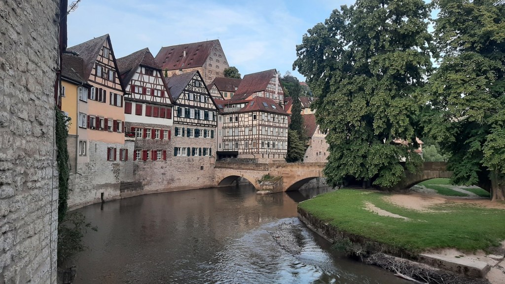 Přemýšlíme, kde se upíchneme na další noc a mě napadá městečko Schwäbisch Hall, které znám, neboť naše firma tam má sídlo svého zakladatele a spoluvlastníka a kde jsem několikrát byl. Je cca 14km od dálnice, není to velká zajížďka. Přijíždíme večer kolem 20:00 hod., parkujeme přímo v centru, ale bohužel hlavní náměstí přímo pod kostelem je „zašpérované“, neboť se zde zase hraje divadlo. Píši „zase“, neboť schody kostela jsou poměrně často v létě používány jako divadelní scéna. Nevadí, náměstí obejdme a jdeme k řece. Rena je mile překvapená jak krásné město tento Schwäbisch je. Stará typická německá architektura, všude čisto a pořádek a klid. To platí i pro štelplac, který je nedaleko u řeky a je zdarma. Tady trávíme klidnou noc.