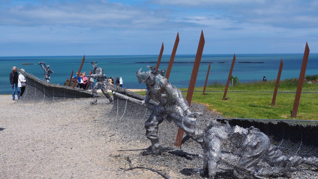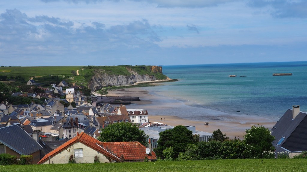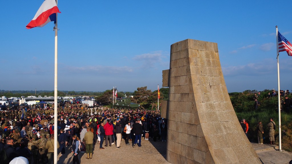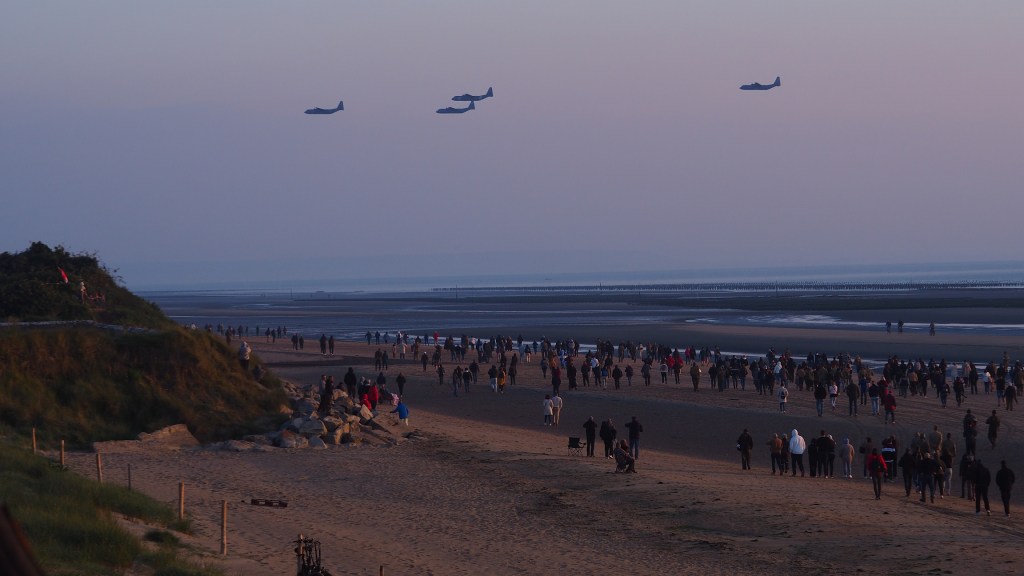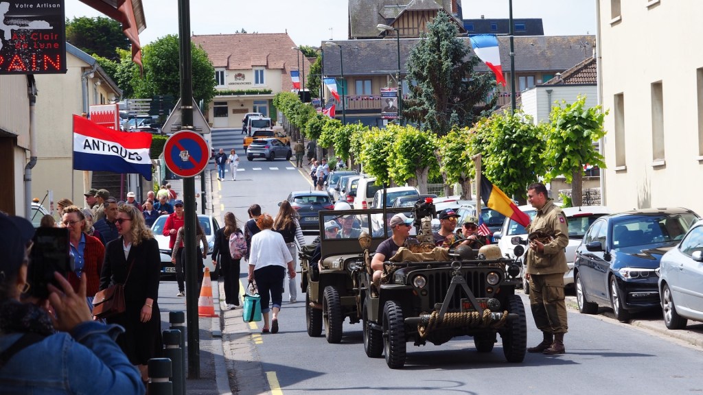 Vstáváme dříve, chceme vyrazit již v 7:00, protože dnešní program bude náročný. Chceme co nejdříve dorazit na vyloďovací pláže a navštívit několik městeček a míst, která stála na počátku oprace Overlord. První má být Arromanches. Víme, že to je velice navštěvované místo, že tam bude živo a tak plánujeme nechat opět jedno auto o vesnici dříve. Při dojíždění k pobřeží je zřejmé, že doprava výrazně houstne a to zejména zapojením dobové techniky a i návštěvníků jsou mraky. Zastavujeme ve vesnici Asnelles, kde se nám nějakou obrovskou náhodou podařilo získat 2 místa na zaparkování po právě odjíždějících vozidlech a rozhodujeme se, že zde necháme obě auta a do Arromanches dojdeme pěšky. Je to něco přes 2 km, tak to není zase tak náročné. Nebylo to špatné řešení. Máme možnost tak cestou navštívit památník operace a obětí akce, který je celkem nový, byl zřízen v době 75. výročí vylodění, jdeme kolem kina 360o a z kopce sestupujeme k městečku, kdy se nám cestou nabízí nádherný pohled na celou kulisu tehdejšího dění. Nad hlavou v těsné blízkosti nám několikrát prolétnou velké transportní letouny s invazními pruhy. Městečko žije, jako obvykle je v toto období plné návštěvníků v historických vojenských uniformách, je vyzdobeno vlajkami, trikolórami, je plné prodejních stánků nabízejících předměty odkazujícími na současné výročí. Je také plné historické techniky, některou sledujeme i v akci, kdy např. obojživelná vozidla vjedou do moře a přejdou do režimu „plavby“ podél pobřeží. Je pěkné si jen tak sednout a sledovat celý ten šrumec, tu krásnou atmosféru, která nemůže nikoho nechat klidným a bez emocí. Jediné, co tady po letech chybí, jsou obrovské betonové bloky provizorního přístavu, který byl pro účely vyloďování zbudován v roce 1944 a které tu ještě před 5ti lety byly. Asi se už rozpadly, a nebo spíše byly z bezpečnostních důvodu odstraněny.