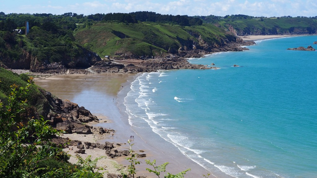 Pokračujeme v cestě po severním pobřeží. Zastavujeme ve městě Hillion a jdeme na krátkou procházku k moři. Dále máme pauzu s prohlídkou města Saint – Brieuc, kde se částečně účastníme i nedělní mše v místním kostele. Dále si komplikovaně úzkou silnicí sjíždíme na plážové parkoviště městečka Saint – Laurent de la Mer, kde je při odlivu tolik mušlí různých barev a tvarů, že až oči přechází. Při odjezdu zjišťujeme, že sem byl zákaz vjezdu obytek. Dále zastavujeme u městečka či vesnice Plouha. Zde jdeme procházkou k místu, které je nazýváno Gwin Zégal. Krásná koupací pláž, kde se také dalo poprvé vykoupat. Je zde přírodní přístav a je odliv. Tzn. lodě leží na suchu. Je to krásné malebné prostředí, kde se nám moc líbí.