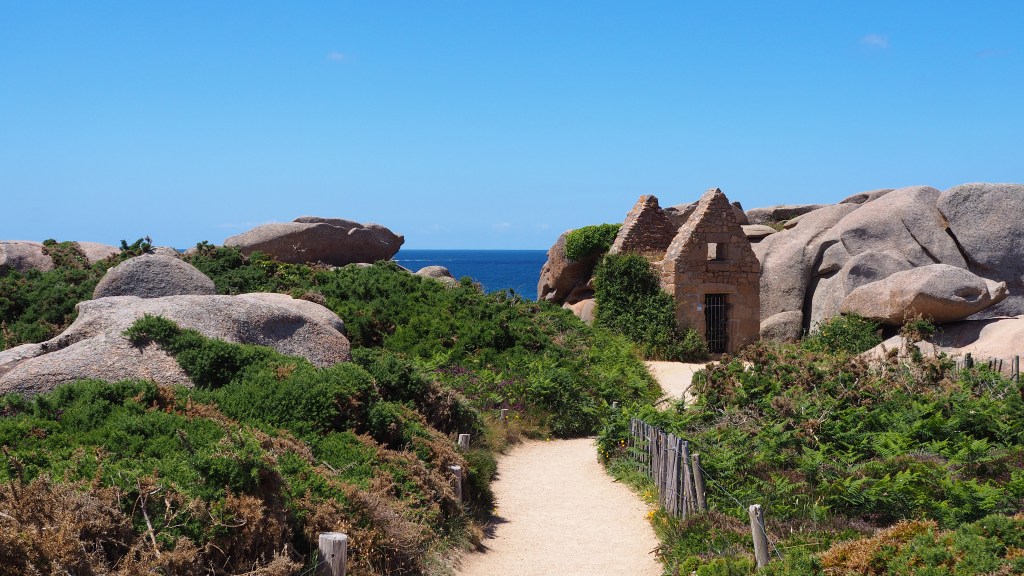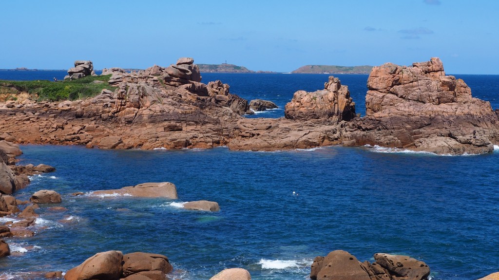 Pokračujeme kousek dál po pobřeží a parkujeme v městečku Ploumanac’h na štelplacu za 6,75€. Jde spíše o velké travnaté parkoviště u nějakého sportoviště a je tu alespoň veřejné WC. Odpoledne jdeme na výlet podél moře. Jsme na „Côte de Granit Rose“ – pobřeží růžového granitu. Jde o jeden z nejkrásnějších úseků bretaňského pobřeží. Jeho kouzlo spočívá v kontrastu: na jedné straně z hlubin na povrch vyvřelá růžová (případně oranžová) žula, na druhé straně zlatý písek a smaragdově zelené příbřežní vody. Podél pobřeží vede turistická cesta Sentier des Douaniers, ze které je nádherný výhled na všechny ty členité, nádherné kamenné útvary spadající do moře. A tak pomalu při nesčetném focení přicházíme k dalšímu fotogenickému útvaru, kterým je lighthouse, tedy maják Phare de Men Ruz, který je dosud činný. Stavba je složena z růžové žuly a označuje vstup do kanálu vedoucího do přístavu Ploumanac’h (Wikipedia).