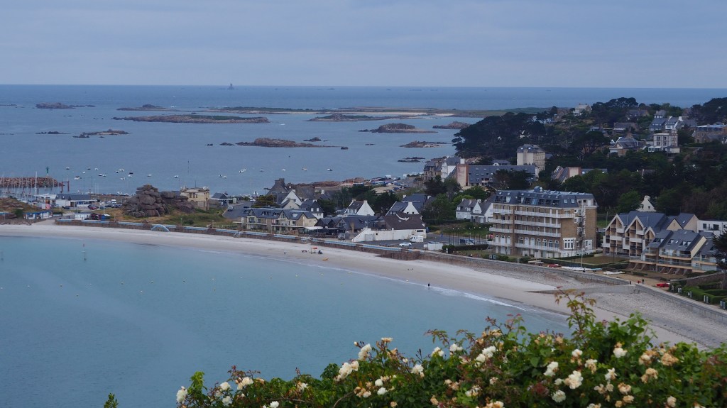 Dnes je den, kdy se budeme odpoledne loučit s našimi přáteli z Rimoru a obrátíme náš směr na východ, abychom se začali přibližovat k domovu. Bude nás čekat cesta zpět v délce cca 2 000 km. Ale to vše až odpoledne. Teď se posuneme ještě trochu na západ do městečka Trébuerden, což je poslední městečko na granitovém pobřeží. Cestou se ale ještě zastavíme u regulerního štelplacu v Ploumanac’h, kde se zbavíme obsahu WC kazety a natankujeme naftu. V Trébuerdenu zaparkujeme na místě pro karavany ovšem mimo obec vysoko nad krásným poloostrovem a sestupujeme na pobřeží. Po promenádě se dostáváme do městečka. Trébuerden je „lázeňské městečko“, je zde vidět nastavení pro sezónní klientelu. Je zde rozlehlá písčitá pláž vhodná ke koupání, dokonce na nábřeží řada převlékacích kabin. Vystupujeme ještě na vrcholek kopce na jednom z malých poloostrovů a máme nádherný pohled na přístav a město.
