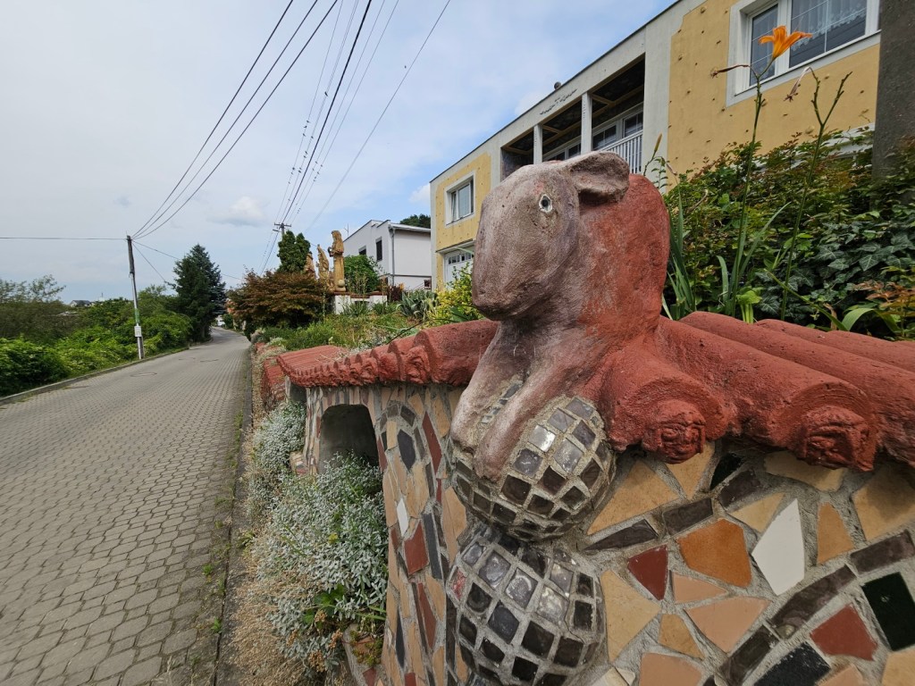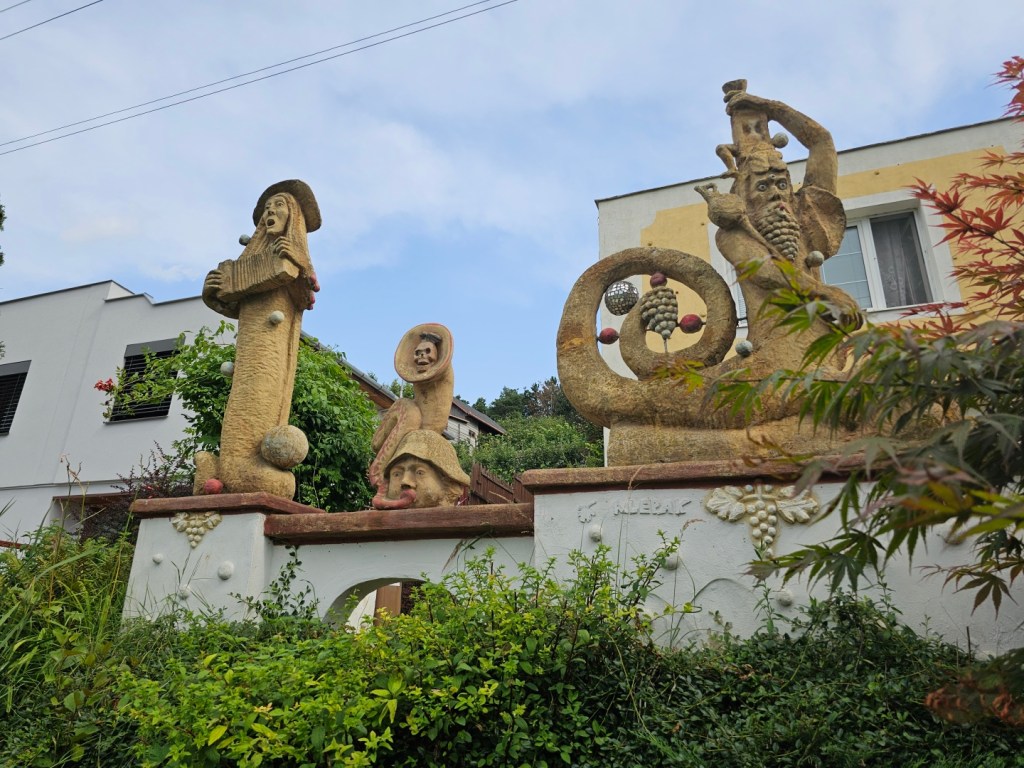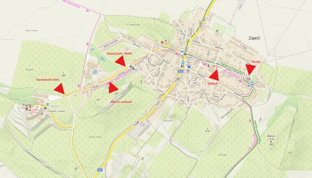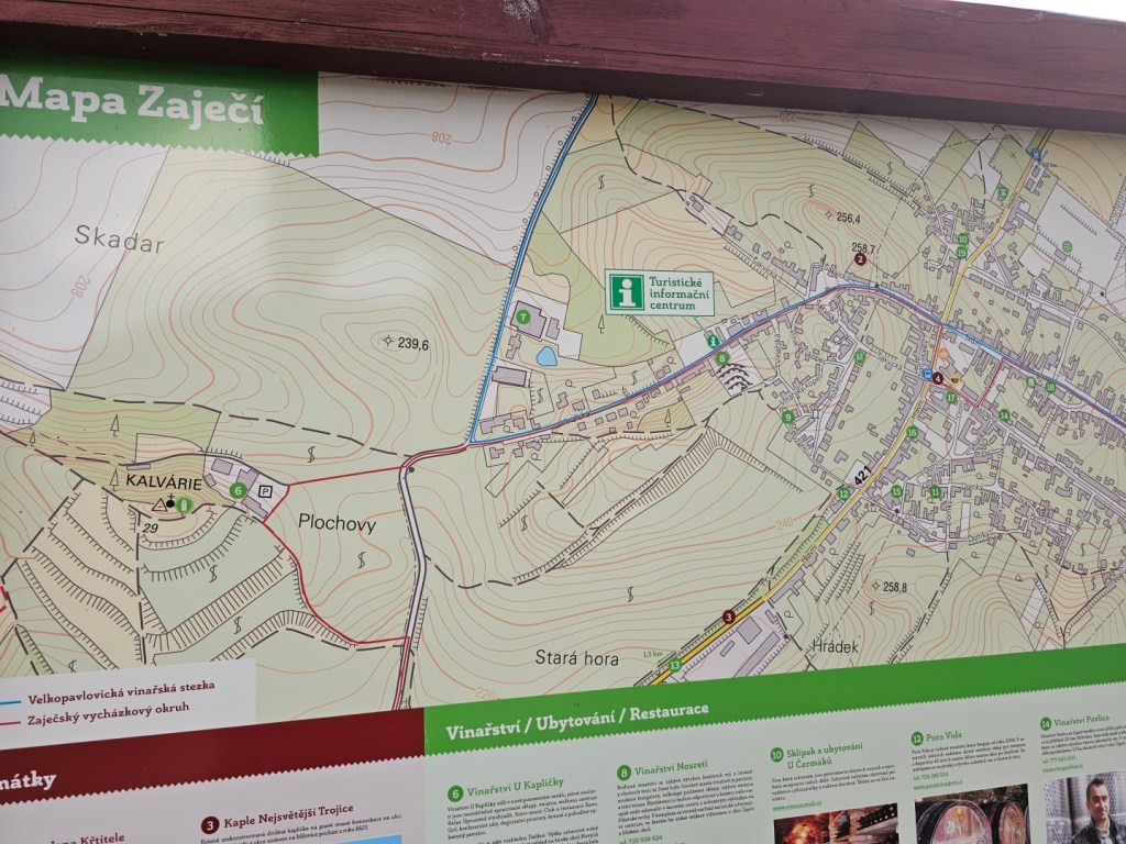 Od vinařství se jde projít po obci. Hned kousek od vinařství se nachází domek obklopený sochami a o kus dál i lanový park u vinařství Zajíci ze Zaječí (dříve Nosreti). Toto vinařství sice uvádí, že má také stellplatz, ale jedná se spíše o kemp pro obytná vozidla, platí se zde jak za obytné vozidlo (400 Kč), tak i za přípojku elektrické energie (150 Kč) tak i za dospělou osobu (150 Kč) a dítě (100 Kč) – více viz https://www.zajicizezajeci.cz/stellplatz. V obci je tak pro karavanisty připraven jak tento kemp, tak i výše popsané karavanové stání – bude zajímavé sledovat, zda se změní ceny, neboť v kempu nechá rodina 2+2 s elektřinou 1 050 Kč za noc, tedy dvojnásobek ceny výše popsaného stellplatzu.