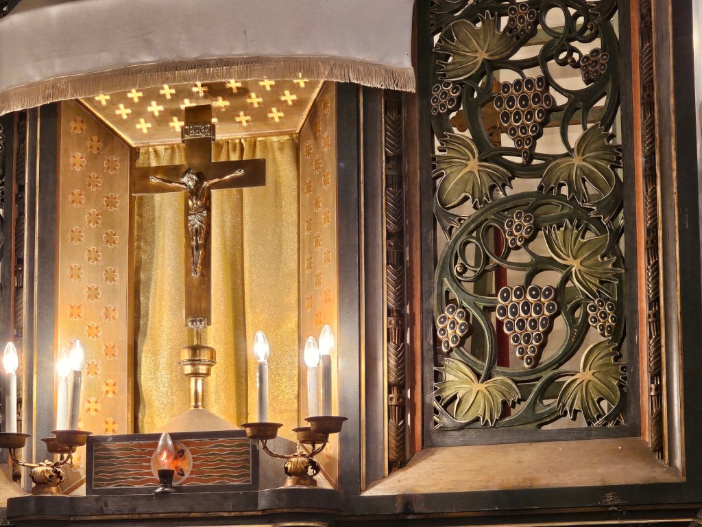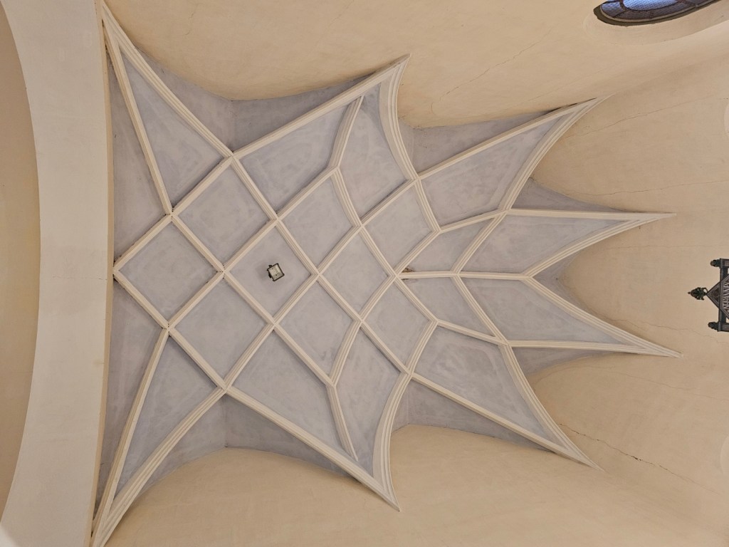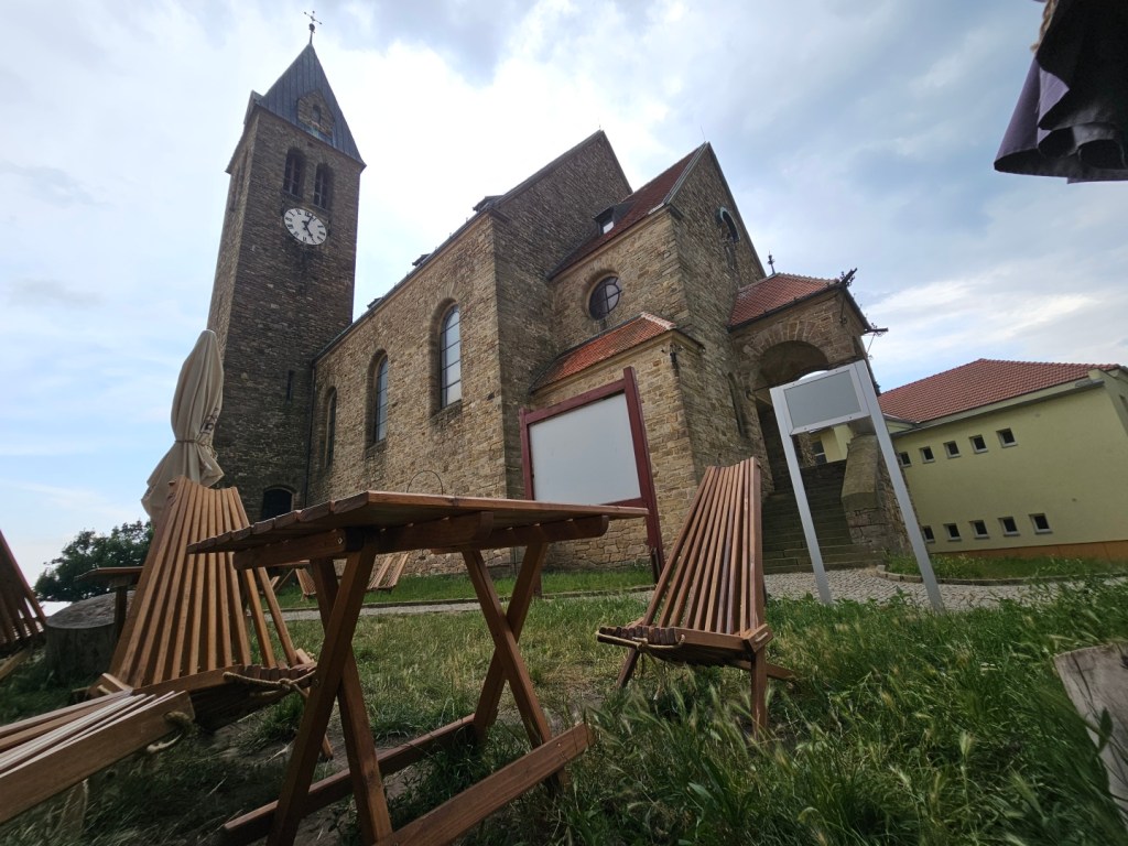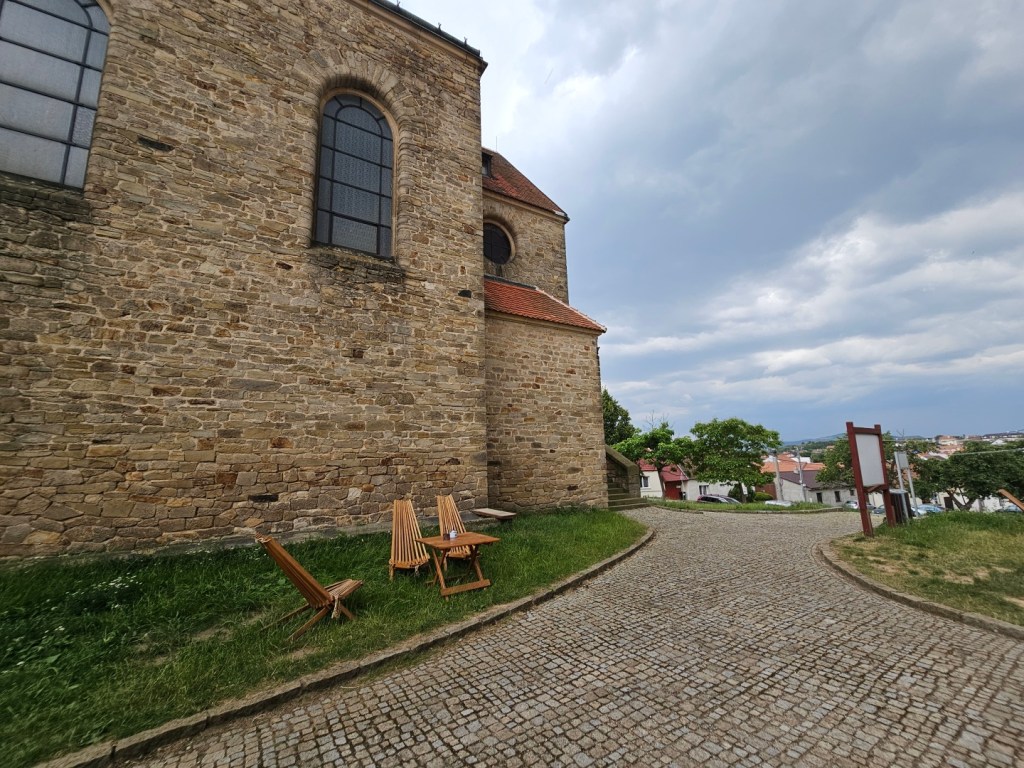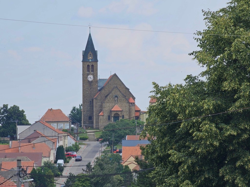 A pokud budete pokračovat dále, upoutá pozornost kostel . Je takovou dominantou obce…byť díky odsunu původního německého obyvatelstva po druhé světové válce se zde duchovna kamsi vytratilo a kostel je tak spíše již jen památkou. Pod ním lze nalézt občerstvení (s možností koupě vína) a možnost objednat si prohlídku kostela (100 Kč osoba, denně od 10 dopoledne do cca 22 hodin) – prohlídka zahrnuje výklad a výstup na kostelní věž, odkud se nabízí výhled ven na vesnici a pohled na instalované hodiny a zvony.