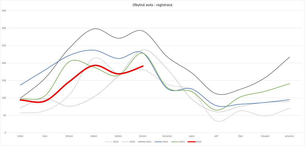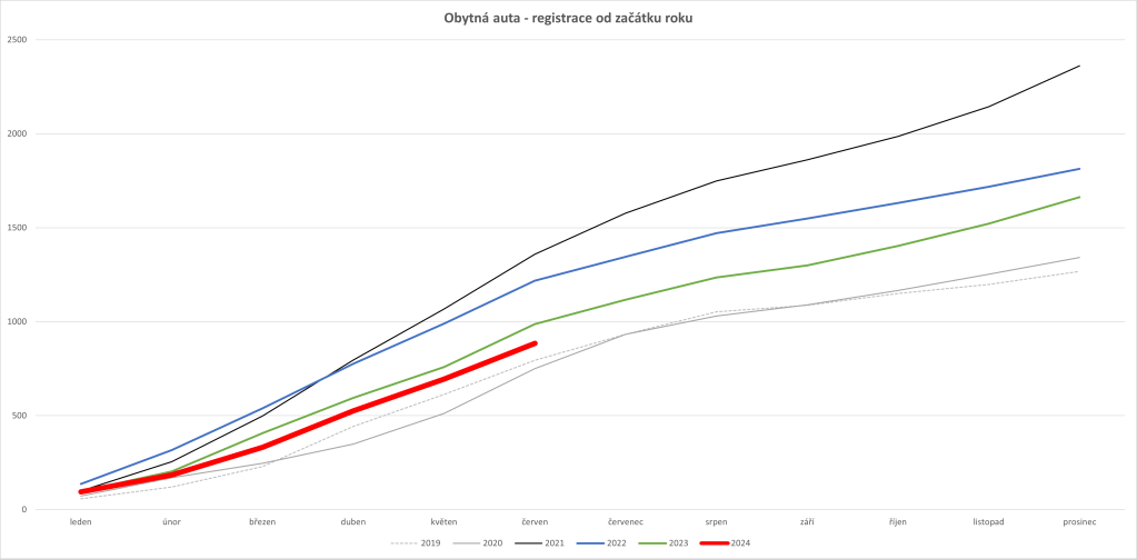V meziročním srovnání je 191 aut poměrně málo, jedná se o nejhorší výsledek za posledních pět let. Nižší počet registrací byl naposledy v roce 2019, kdy se registrovalo 181 vozidel. Na druhou stranu, pokud se porovnají výsledky za celé pololetí, bylo to 794 aut v roce 2019 vs 885 obytných vozidel v roce 2024 – zájem je tedy stále vyšší než v minulosti.