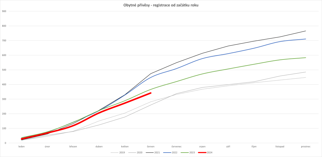 V červnu 2024 se jako nových registrovalo v České republice celkem 191 obytných aut a 69 obytných přívěsů. Počet registrovaných nových obytných aut tak za první pololetí tohoto roku dosáhl čísla 885 , u obytných přívěsů se pak jedná o 342 vozidel. Došlo i k mírné aktualizaci údajů za předchozí měsíce po upřesnění dat z MD.