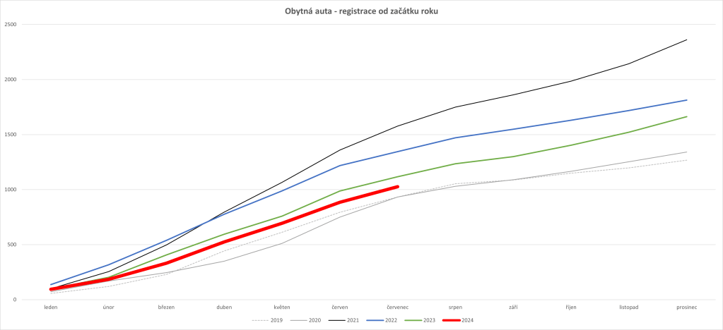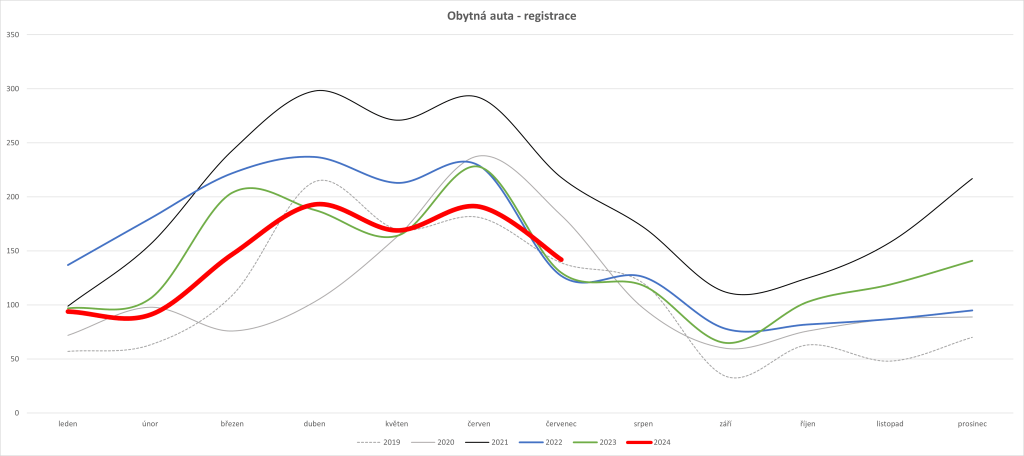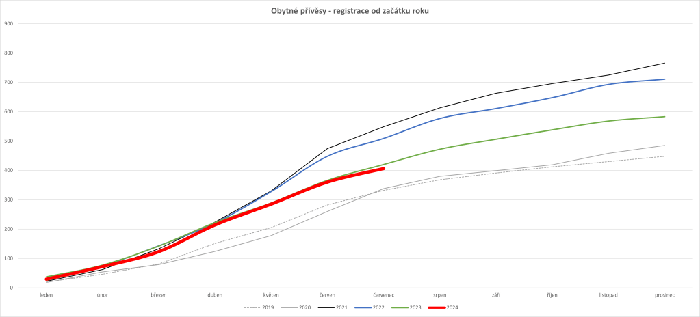 V červenci 2024 se jako nových registrovalo v České republice celkem 142 obytných aut a 46 obytných přívěsů. Počet registrovaných nových obytných aut tak za prvních sedm měsíců ohoto roku přesáhl tisícovku, konkrétně ke konci července činil 1027 vozidel. U obytných přívěsů se pak jedná o více jak 400 vozidel (406 přívěsů), navíc došlo i k mírné aktualizaci údajů za předchozí měsíce po upřesnění dat z MD – celkově si obytné přívěsy polepšily.