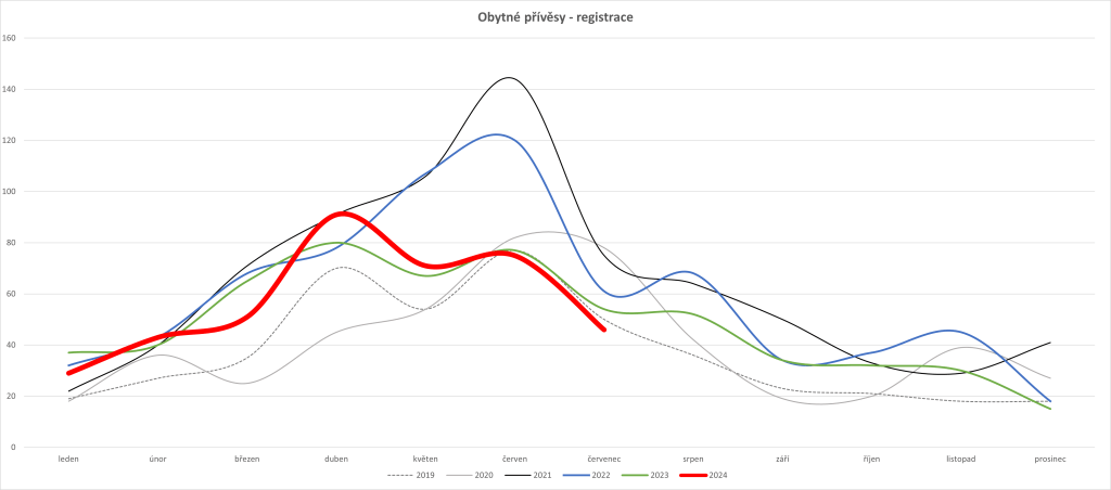 V meziročním srovnání zájem o karavany (obytné přívěsy) opět poklesl, 15 % je skutečně výrazný pokles. Je nutné si ale uvědomit, že i přes klesající registrace je zájem o přívěsy stále větší než tomu bylo minimálně do roku 2020 a v prvních sedmi měsících se registrovala více nových přívěsů než za celý rok 2018, víceméně zájem kopíruje předchozí rok.