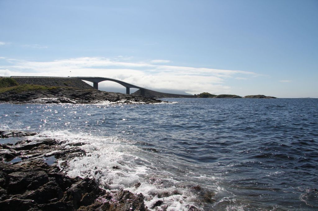 Jakmile se cesta na konci údolí překlopí na druhou stranu hory směrem k Andalsnes, vjíždíme do mraku a z něj se už nedostaneme. Zastavujeme na parkovišti u vodopádu Stigfossen, a jdeme na vyhlídku, ale vodopád ani silnici vůbec nevidíme a pouze slyšíme hukot vody pod námi. Škoda, tentokrát to nevyšlo. Sedáme do auta a jedeme zpět kolem přístavu Linge do Vestnes. Tady vidíme na totemu čerpací stanice Shell zatím nejnižší cenu nafty v celém Norsku, což využijeme a doplníme nádrž. Trajektem přejíždíme do Molde a hned ve městě děláme servis. Vše zdarma u čerpací stanice. Nakoupíme zásoby a vyrážíme na noc na Atlantic Ocean road. Přijíždíme v podvečer, některá parkoviště postupně zabírají filmaři a jiná jsou beznadějně plná. Naštěstí ještě kousek od severního konce cesty najdeme volné místo pro naše auto a jdeme prozkoumat okolí a zkusit štěstí s rybářskou výbavou. Procházíme ostrůvky na obou stranách silnice a zkoušíme rybařit, ale tady dnes neberou. Zkusíme to znovu zítra.