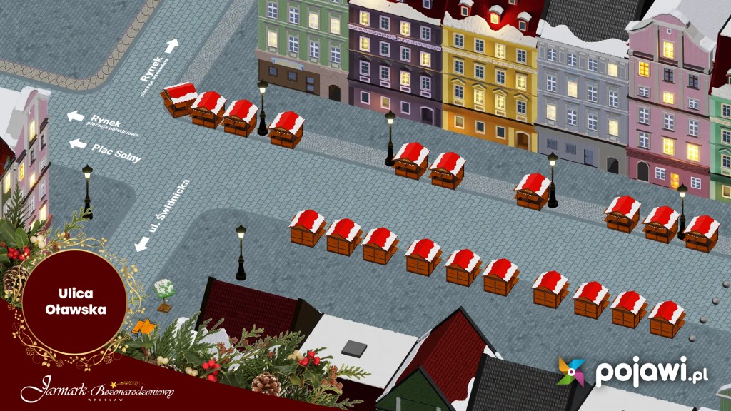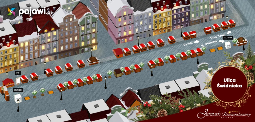 Na vánočním trhu ve Vratislavi lze obdivovat velkolepé nasvícené dekorace, například osvětlený vánoční větrný mlýn. Na stáncích koupíte téměř vše, od šperků, přes rukodělné výrobky (např. malovaná dřevěná vánoční přání), až po značkové oblečení. Četné stánky s občerstvením pak nabízejí delikatesy z regionální i mezinárodní kuchyně – perníky ve tvaru vratislavských domů, alsaské placky, italské sýry, maďarské salámy, španělské churros, dolnoslezský med, uzeniny, turecká baklava, vafle, koláče, pralinky a perníčky.