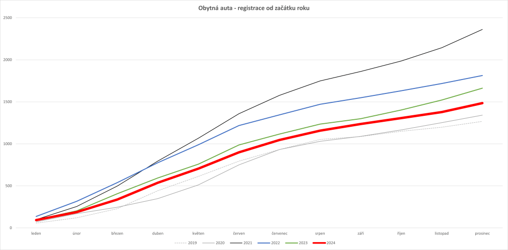V prosinci roku 2024 se jako nových registrovalo v České republice celkem 106 obytných aut a 22 obytných přívěsů. Počet registrovaných nových obytných aut tak v roce 2024 dosáhl 1 485 u obytných přívěsů se pak jedná o 540 vozidel.
