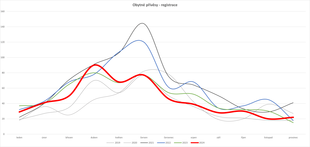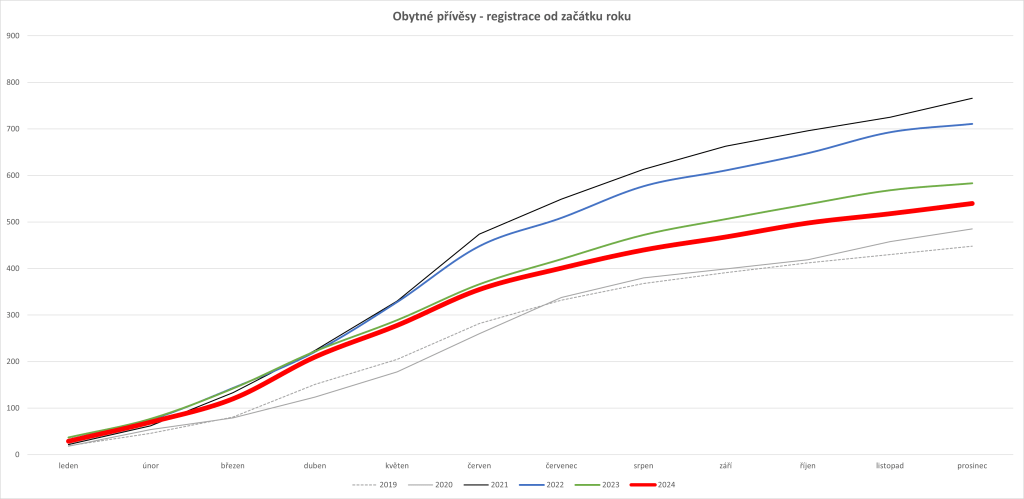 V prosinci 2024 se jako nových registrovalo 22 obytných přívěsů, což je více než v předchozích letech 2022 a 2023. Celkově se pak za celý rok registrovalo jako nových 540 obytných přívěsů, což je pokles o 7 % v porovnání s rokem 2023, ale o 21 % více než v roce 2019.