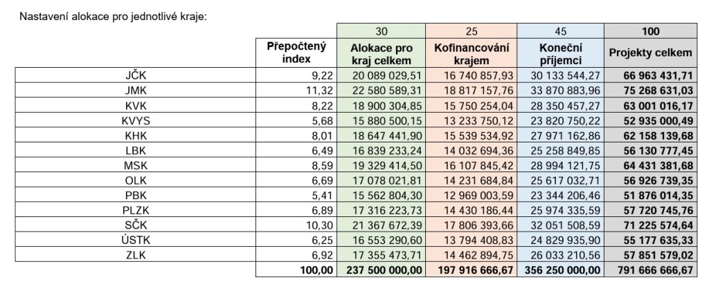 Otevírá se tak cesta pro jednotlivé kraje, které tak mohou vypsat své dotační programy. Nicméně kraje by měly přidat vlastní prostředky, k tomu se připočítává vlastní investice žadatelů. Spoluúčast kraje by měla být minimálně 25 % z celkových nákladů, konečný příjemce by se měl podílet maximálně 45 %. Celkově tak hodnota projektů může dosáhnout částky téměř 800 milionů korun, jak naznačuje tato tabulka: