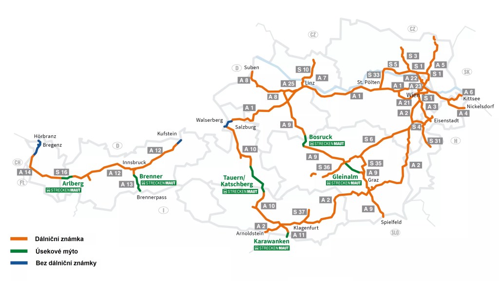Pokud při cestě použijete rakouské dálnice, je nutné za jejich použití zaplatit. Vozidla do 3,5 t a soupravy s tažným vozidlem do 3,5t potřebují pro jízdu dálniční známku, těžší motorová vozidla platí mýtné a potřebují mýtnou jednotku. Některé dálniční úseky jsou zpoplatněny ještě zvlášť, pro jízdu na těchto zvlášť zpoplatněných úsecích není potřeba dálniční známka. jedná se o tunely a také o celou brennerskou dálnici A13. Některé úseky rakouských dálnic lze použít bezplatně viz následující přehledová mapka:
