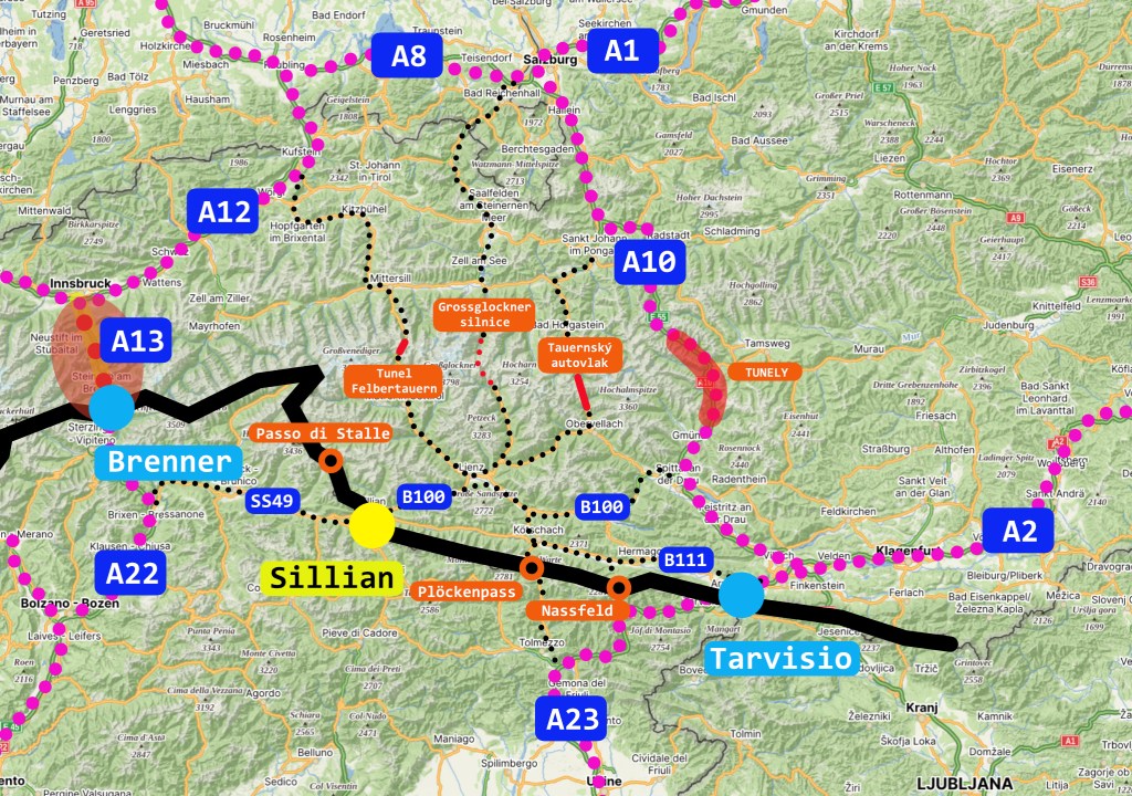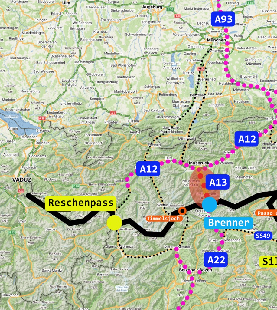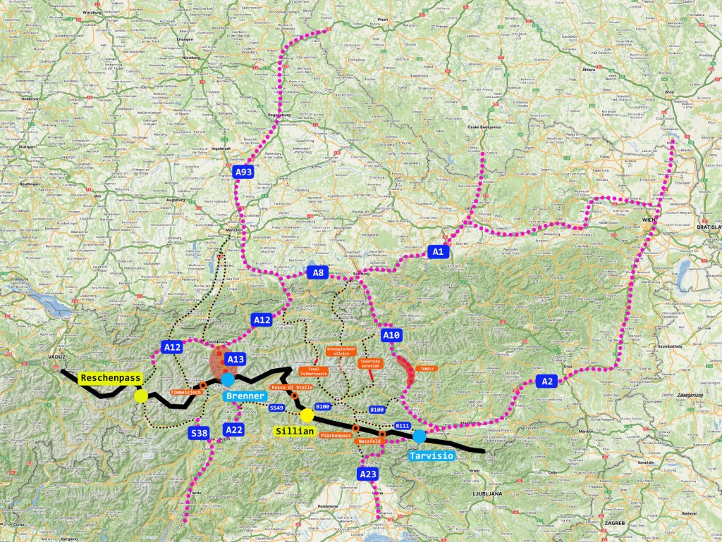 Zub času si ale pomalu a nemilosrdně vybírá svoji daň a tak zejména rakouskou část brennerské dálnice, A13, čekají v následujících letech výrazná omezení provozu. Ty jednoznačně ovlivní její kapacitu a propustnost a přimějí mnoho řidičů hledat jiné trasy, doposud jimi opomíjené. Tento článek by chtěl jen upozornit na možnosti, které se nabízí pro překonání Alp v případě, že průjezd přes Brenner se ukáže jako komplikovaný.
