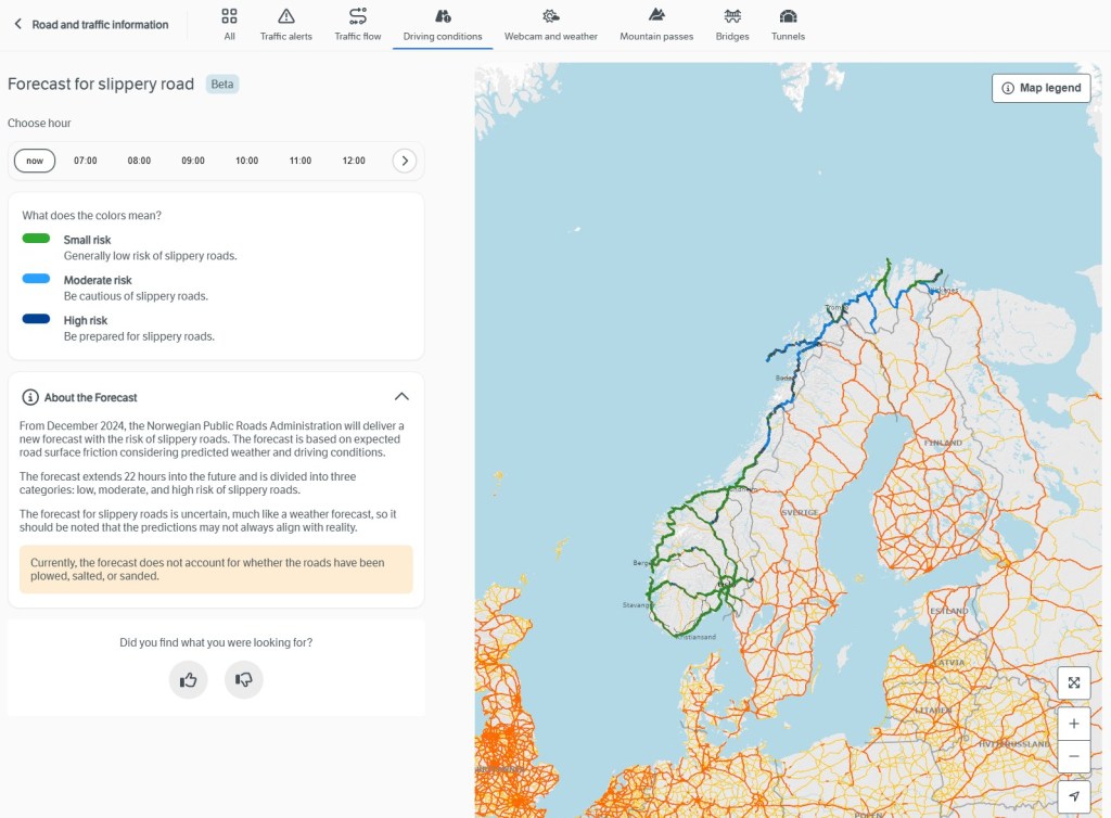 Nová služba poskytuje předpověď pro kluzké silnice na všech evropských silnicích v zemi, národních silnicích a okresních silnicích, a to na následujících 24 hodin. Na mapě se ukazují komunikace s nízkým, středním nebo vysokým rizikem kluzké vozovky, služba je dostupná na adrese https://www.vegvesen.no/trafikk/hvaskjer?layers=hlk&tusort=pop&brsort=pop&fosort=pop&lat=65&lng=15&zoom=3