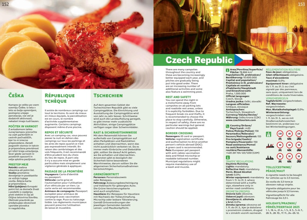 Popisy jsou ve čtyřech jazycích, slovinštině, němčině, angličtině a francouzštině a na více jak 700! stránkách popisuje každou evropskou zemi. U každé uvádí základní údaje ohledně kempování, požadavků na vstup, rychlostí a dalších omezení, seznam prázdnin a důležitá telefonní čísla. Následuje přehled atrakcí pro celou rodinu, v případě Česka jsou to především různé dino-parky a aquaparky, následuje seznam kempů a karavanových stání.