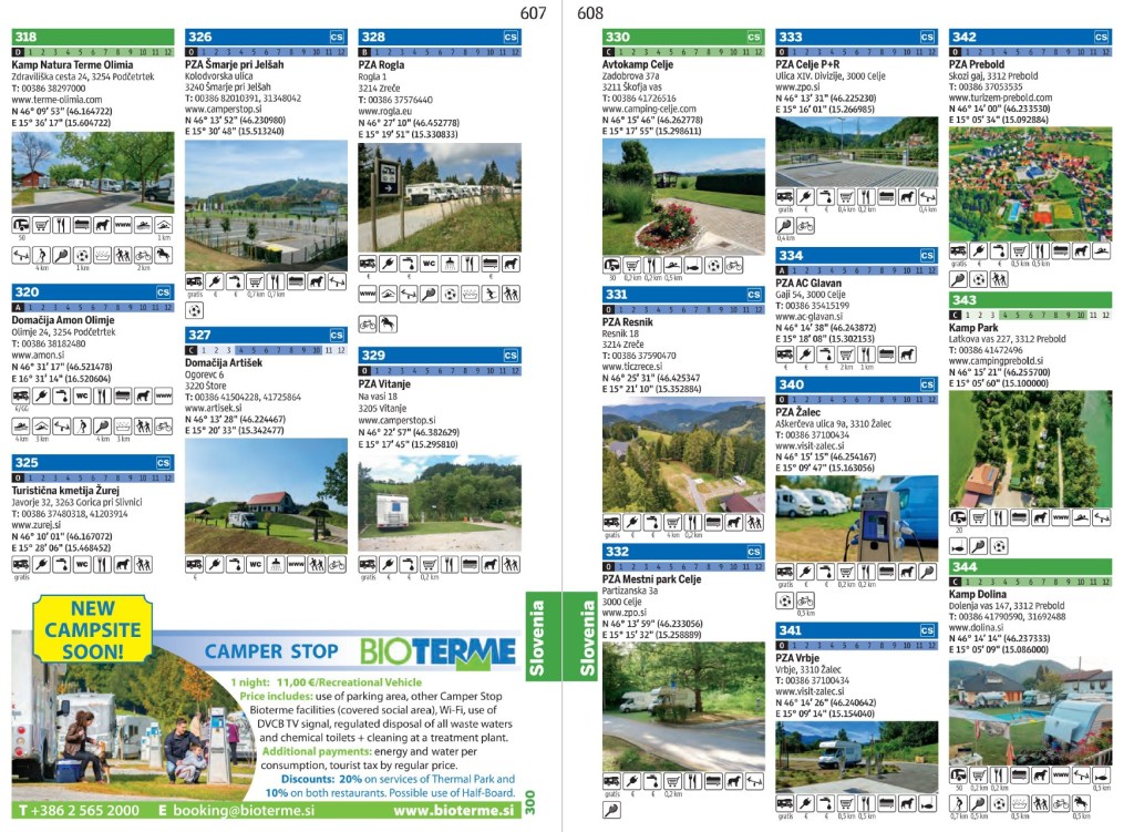 Navíc ale v Slovinsku působí i vydavatelství Avto medija https://www.avtomedija.si/ , které se soustředí především na motoristy a také na cestovatele v obytných vozech (i když jeho záběr je přeci jen trochu širší). Pro karavanisty připravuje tematicky orientované katalogy, v zimě zaměřené na lyžování, v létě pak například na cyklisty. Letos opětovně vydává svůj velký přehled možností pro rodinná dobrodružství v karavanu s názvem KAMPING & KARAVANING. V poměrně tlusté publikaci za 29 € lze najít přehled zábavních parků, vodních parků, lanových parků a podobně a to nejen v Evropě, ale i v některých afrických zemích. A to vše doplněné přehledem kempů a karavanových stání v tom kterém státě.