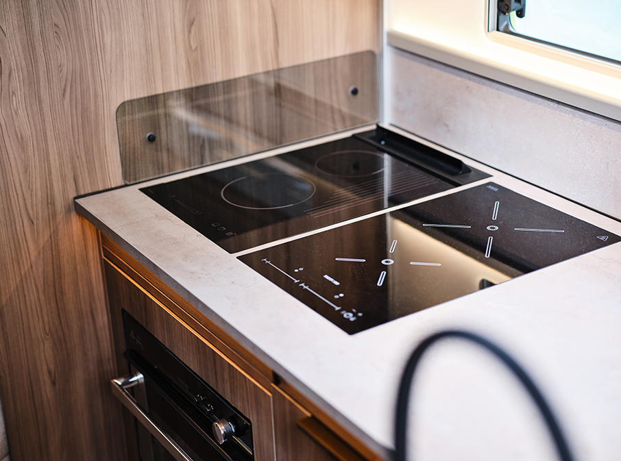Elegantní plynová varná deska pod sklem – kombinuje design indukční desky s efektivitou dvou plynových hořáků. Snadno se čistí a poskytuje při nepoužívání další pracovní plochu.