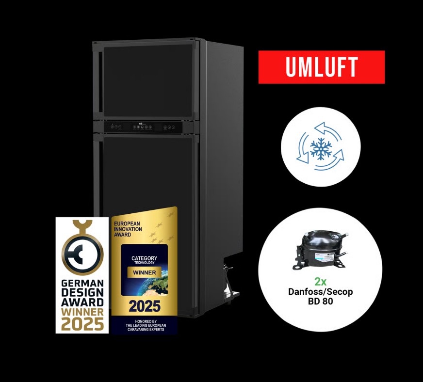 Dva kompresory Danfoss/Secop poskytují dosud nevídaný chladicí výkon. Nízká spotřeba energie, oddělené regulace teploty pro chladničku a mrazák, ovládání přes aplikaci a garance dosažení až -18 °C při venkovní teplotě 35 °C. Cena lednice je cca 3 300 €, více informací zde: https://www.wcs-mobiletechnik.de/shop/kuehlboxen-kuehlschraenke/twin-tower-air-speed-kompressor-kuehlschrank-inkl.-speditionsversand/