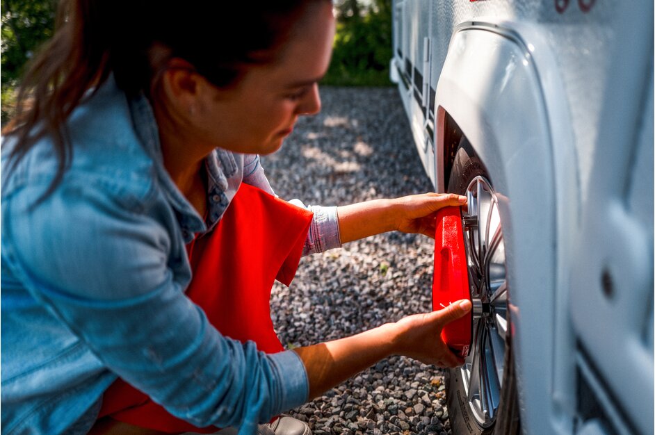 Vyrovnávací klíny s malou nastavitelnou zarážkou a aplikací pro přesné nastavení polohy vozidla. V ČR se prodávají i u nás za cca 3 000 Kč, více viz https://www.lippertcomponents.eu/caravanning-products/accessories/level9/