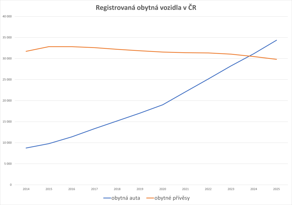 Stále více se ale rozevírají pomyslné nůžky mezi obytnými auty a přívěsy. Zatímco v roce 2024, kdy poprvé v historii počet obytných aut překonal počet přívěsů, činil rozdíl ještě poměrně nevýrazných 667 vozidel, tak na konci roku 2025 je u nás obytných aut již o 4.542 více než obytných přívěsů. Ostatně pohled na tento graf je více než výmluvný: