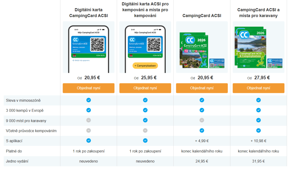 - Svět karavanů: ACSI CampingCard 2026 EN – 617 Kč, s nejlevnějším poštovným 697 Kč.