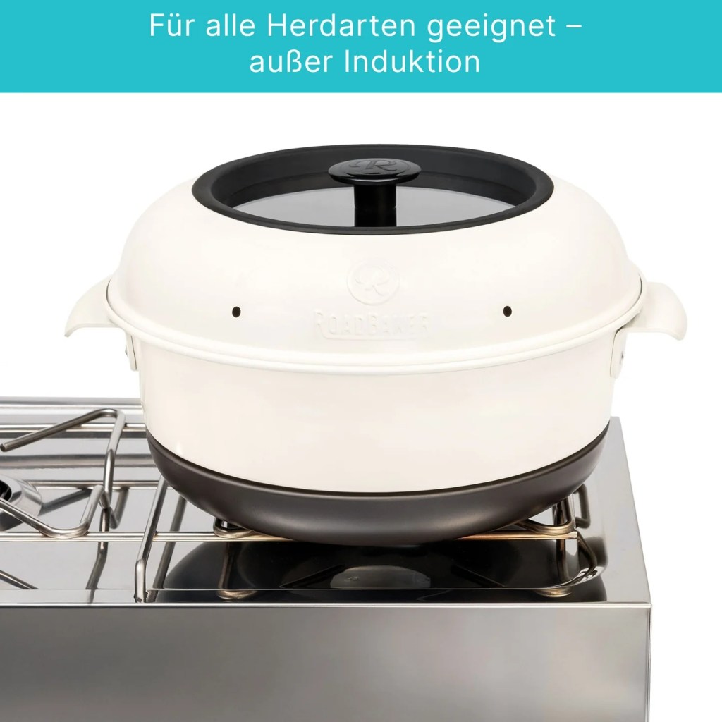 RoadBaker: Má skleněné víko, takže jídlo můžete sledovat během pečení bez otevírání. Šetří čas, energii a udržuje stálou teplotu – ideální pro kempování.
