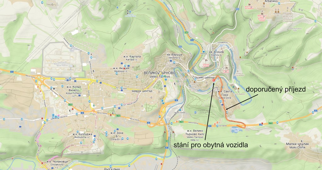 Město zatím stellplatz oficiálně nepojmenovalo, a proto jej redakce camping.bg označuje názvem Tsarevets Camperstop. Nachází se na městském parkovišti v ulici Kraibrežna (Крайбрежна) a je vzdálen pouhých 5 minut chůze od vstupu do pevnosti Tsarevets (https://www.museumvt.com/en/). Stejná vzdálenost dělí stellplatz i od malebných uliček historického centra města. Místo je i na P4N – https://park4night.com/en/place/164581