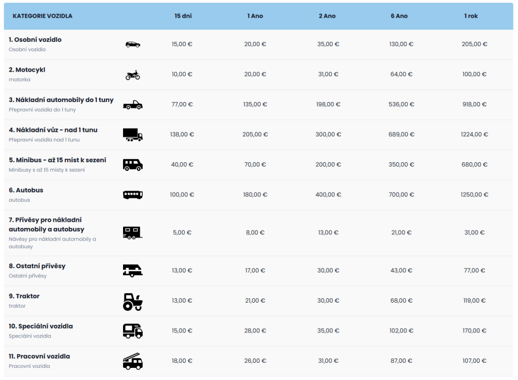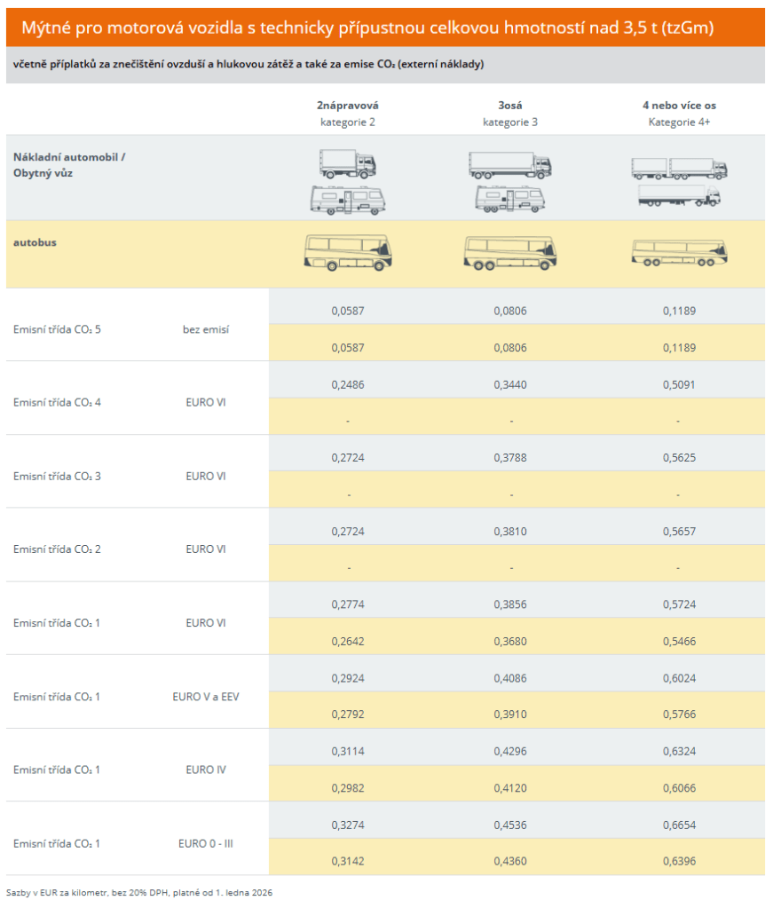 Od 13.3.2024 stačí známka i pro obytná vozidla kategorie M1 nad 3500 kg. Tato vozidla tak nepodléhají mýtnému. Ceny pro rok 2026: