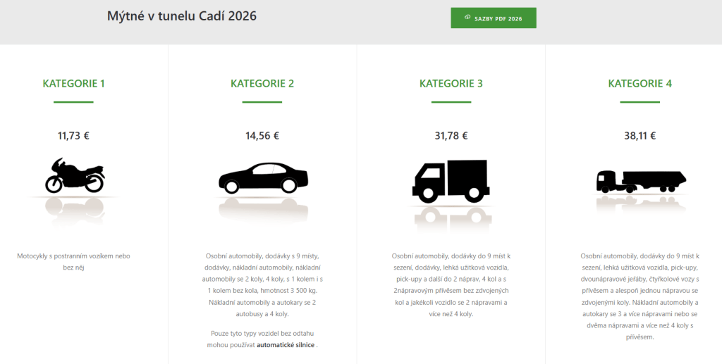 | Kategorie I | Dvounápravová vozidla s výškou měřenou na první nápravě menší než 1,3 m (motocykly, osobní automobily s registrací do 7 míst a lehká dodávková vozidla s přípustnou užitečnou hmotností do 850 kg). |