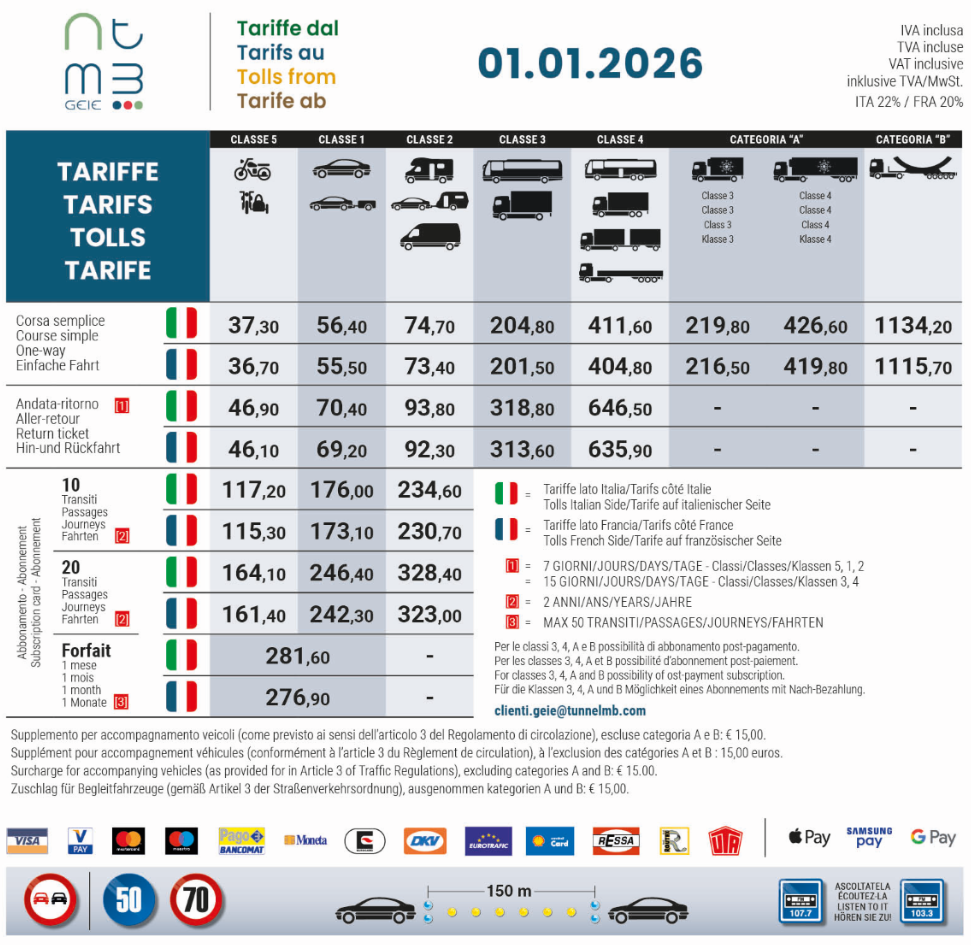 Souprava osobního auta s přívěsem a obytné auto do 3,5 t s výškou do 3 m zaplatí za průjezd 14,20 €, obytné auto nad 3,5 t nebo s výškou nad 3 m zaplatí 16,30 €.