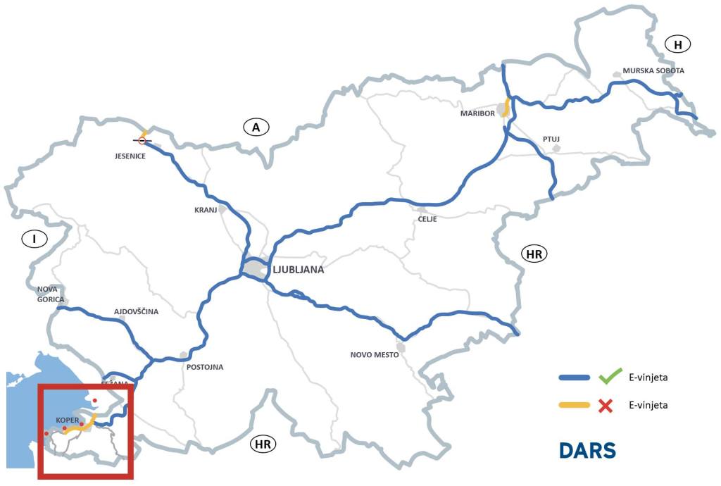 Rychlostní silnice Škofije–Koper–Izola (resp. komunikace označené dříve jako H5 a H6, nově G1-11 a G2-111), je nyní klasifikována jako hlavní silnice a není na ní tedy od začátku roku 2026 vyžadována dálniční známka pro osobní vozidla. Zároveň ale dochází k úpravě maximální povolené rychlosti na 90 km/h místo 110 km/h. Pro vozidla nad 3,5 t, včetně obytných vozů nad 3,5 tuny, zůstává mýtné nezměněno a používání karty DarsGo je zde i nadále povinné.