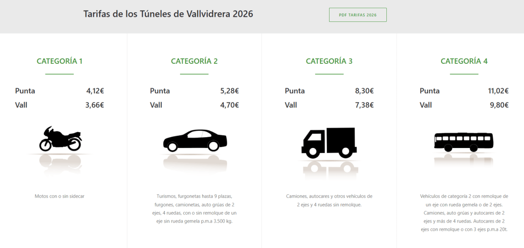 zpoplatněny jdou dva tunely v jihovýchodní části Španělska. Túnel de Vallvidrera u Barcelony a Túnel del Cadí u Andory. Tunely jsou součástí zpoplatněných dálnic, mýtné lze tedy platit ručně na mýtných branách nebo prostřednictvím systému Via-T. Rozdělení je podobné jako v případě dálnic, jen se rozeznávají 4 kategorie. Opět platí, že běžné soupravy a obytné vozy spadnou do běžné cenové kategorie, zde označené jako Kategorie 2 (odpovídá kategorii Ligeros na dálnicích).